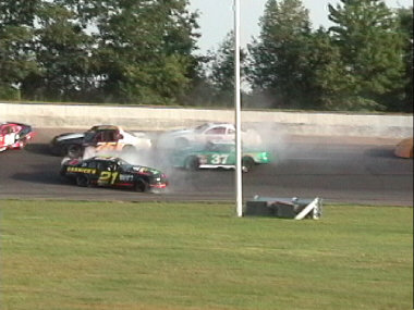 Late Model early leader George Greco Jr. (21) spins in turn 2