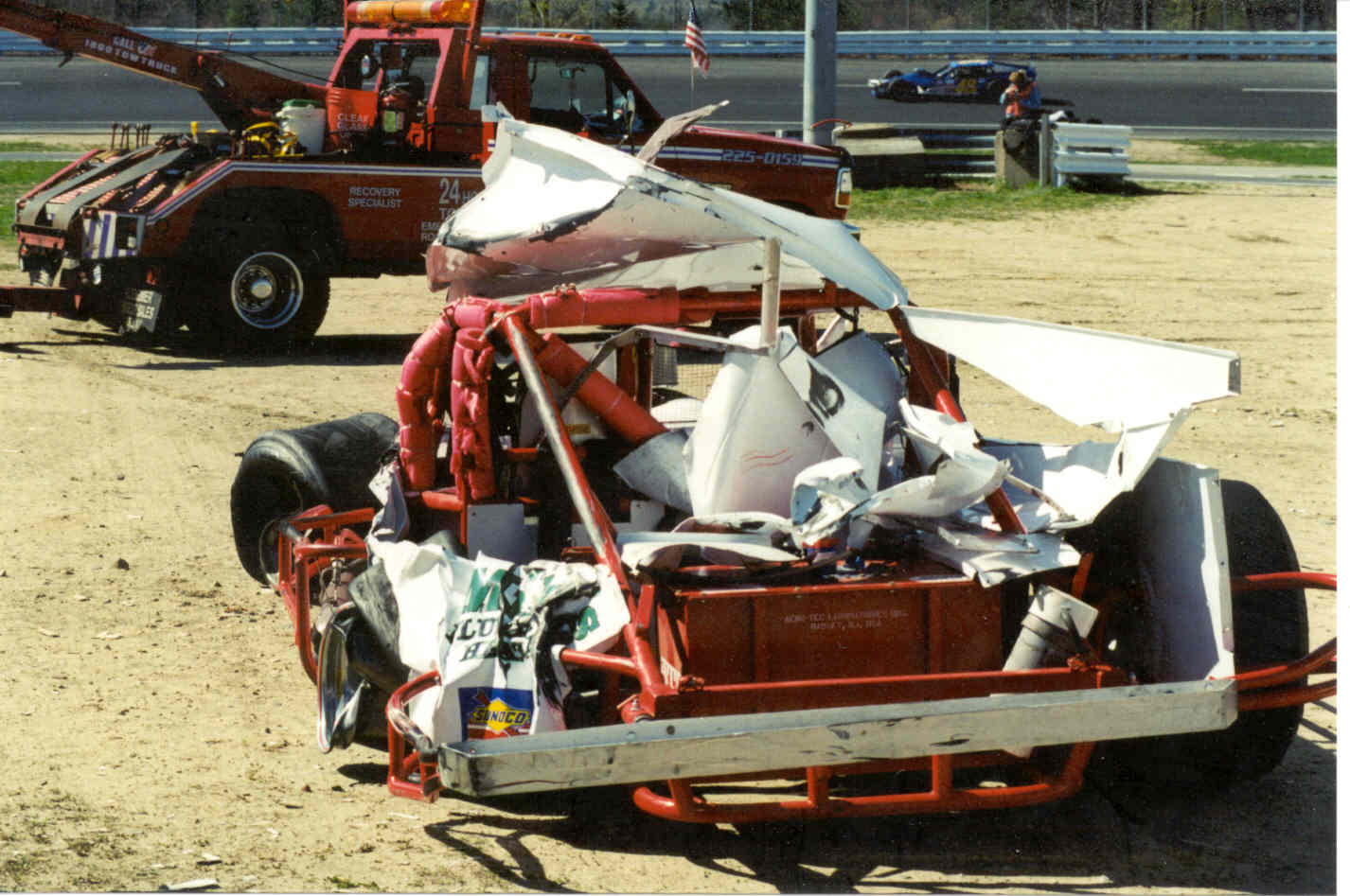 Gerry Savage's (88) sk modified after a crash on the backstretch. He was uninjured - all the safety equipment worked.