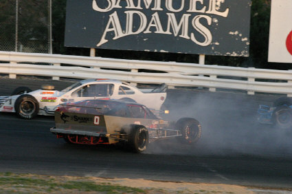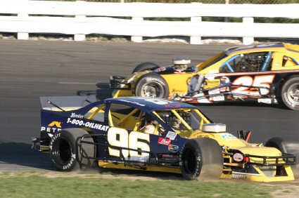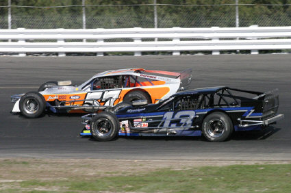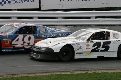 sscm11 - Woody Pitkat (25) passes leader Joe Rzeszutek on his way to victory in the late model feature