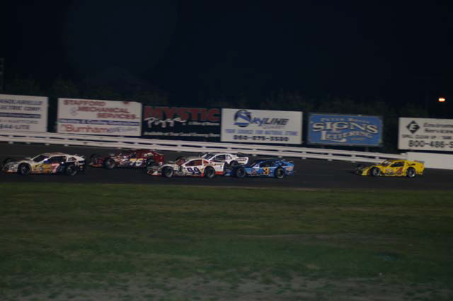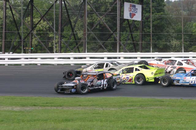 Stafford Speedway 5-3--03 Photos by Cliff Moon Jerry Marquis (3) uses traffic and experience to pass Todd Szegedy