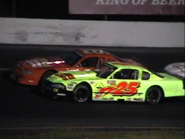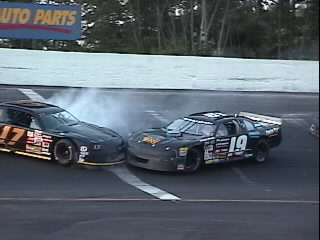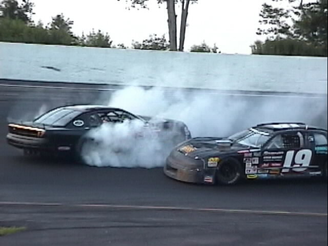 Pro Stock feature action TUCKER REYNOLDS, SR. (17) and PHIL RONDEAU (19) spin between turn 3 & 4