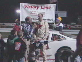 Pro Stock feature #1 winner Dick Houlihan(1) receiving congratulations from chief steward Dick Brooks